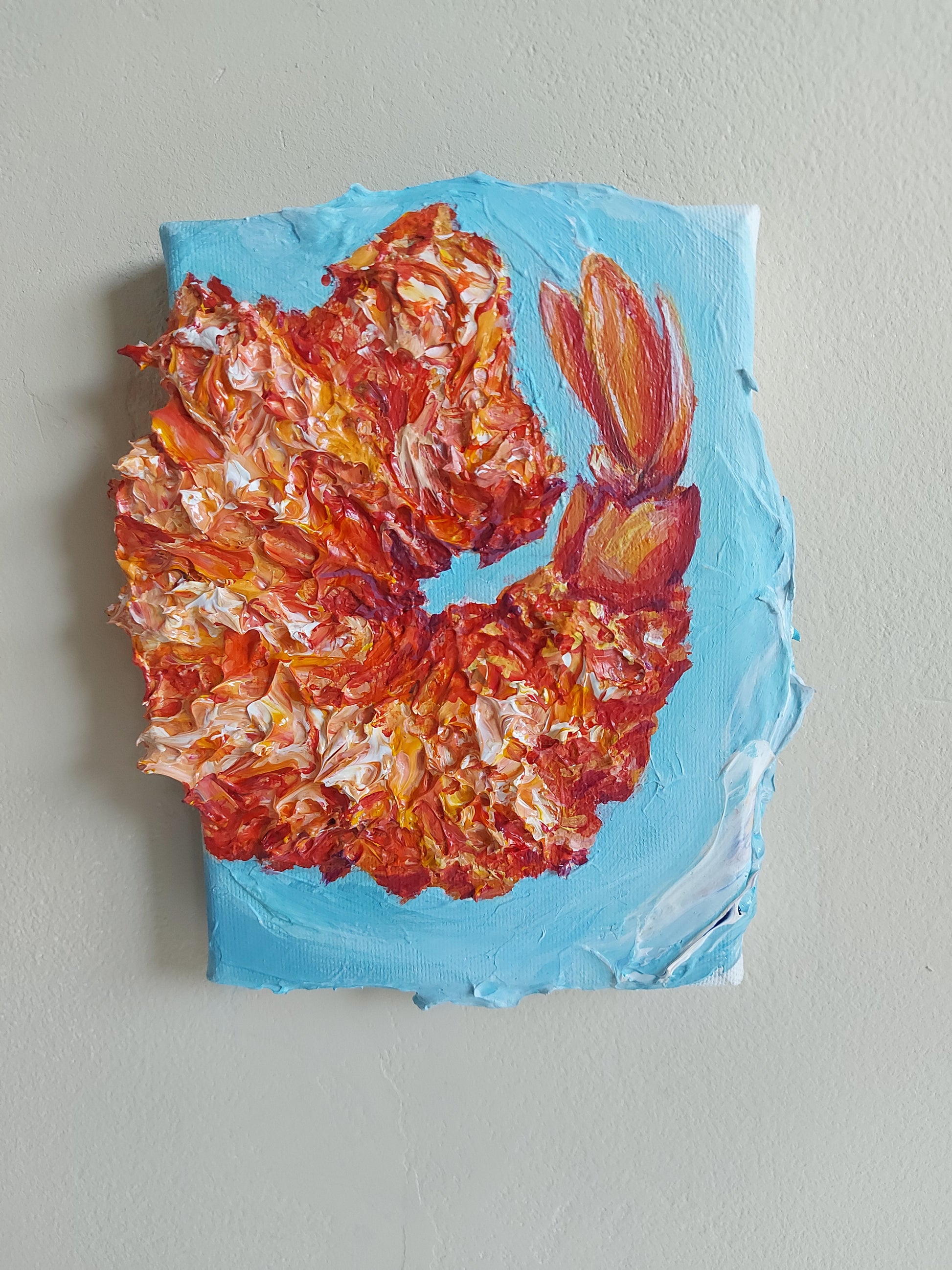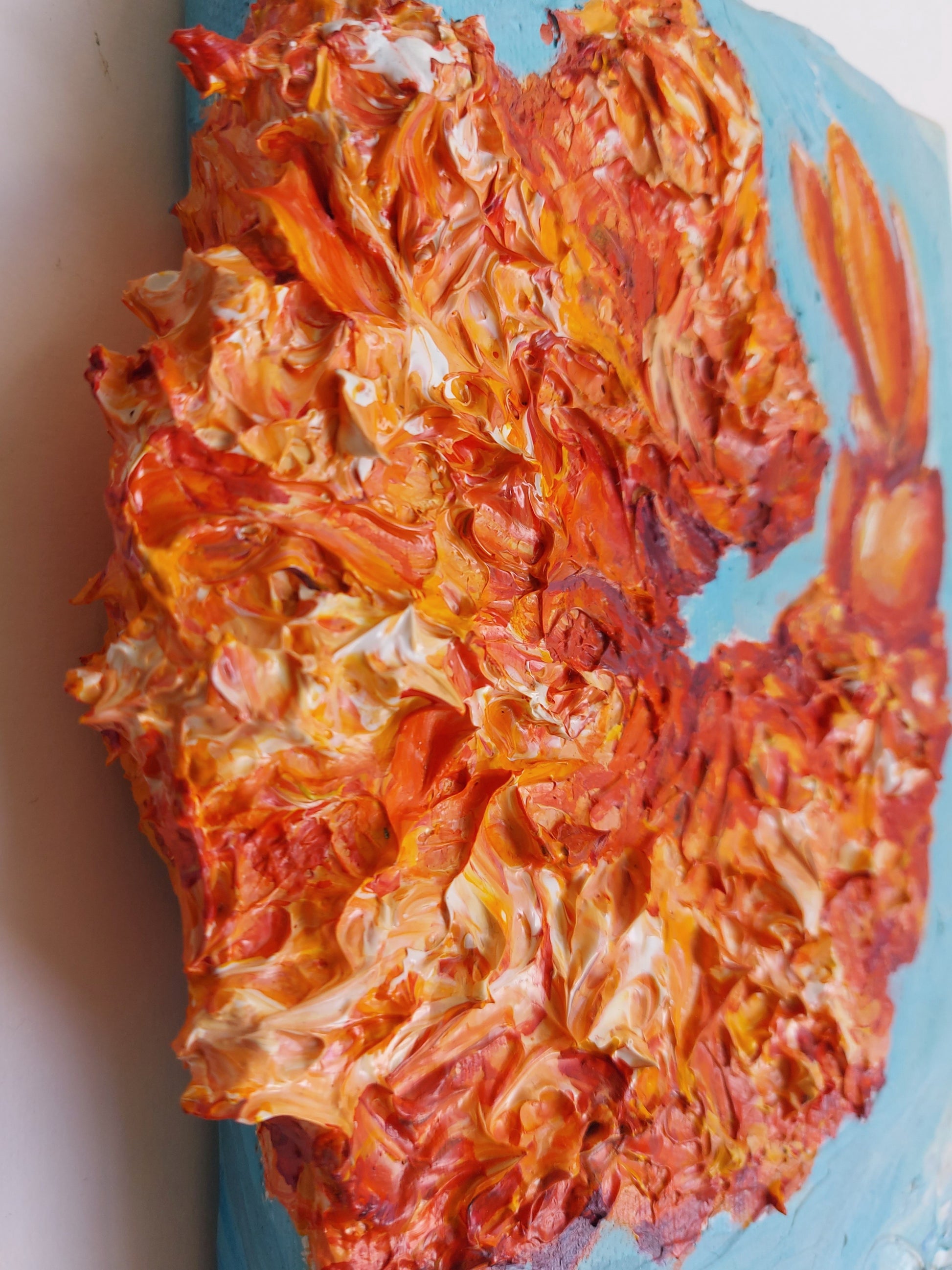 Hand-painted in acrylic with medium, featuring the impasto technique that creates a lively 3D texture and a ceramic-like effect.