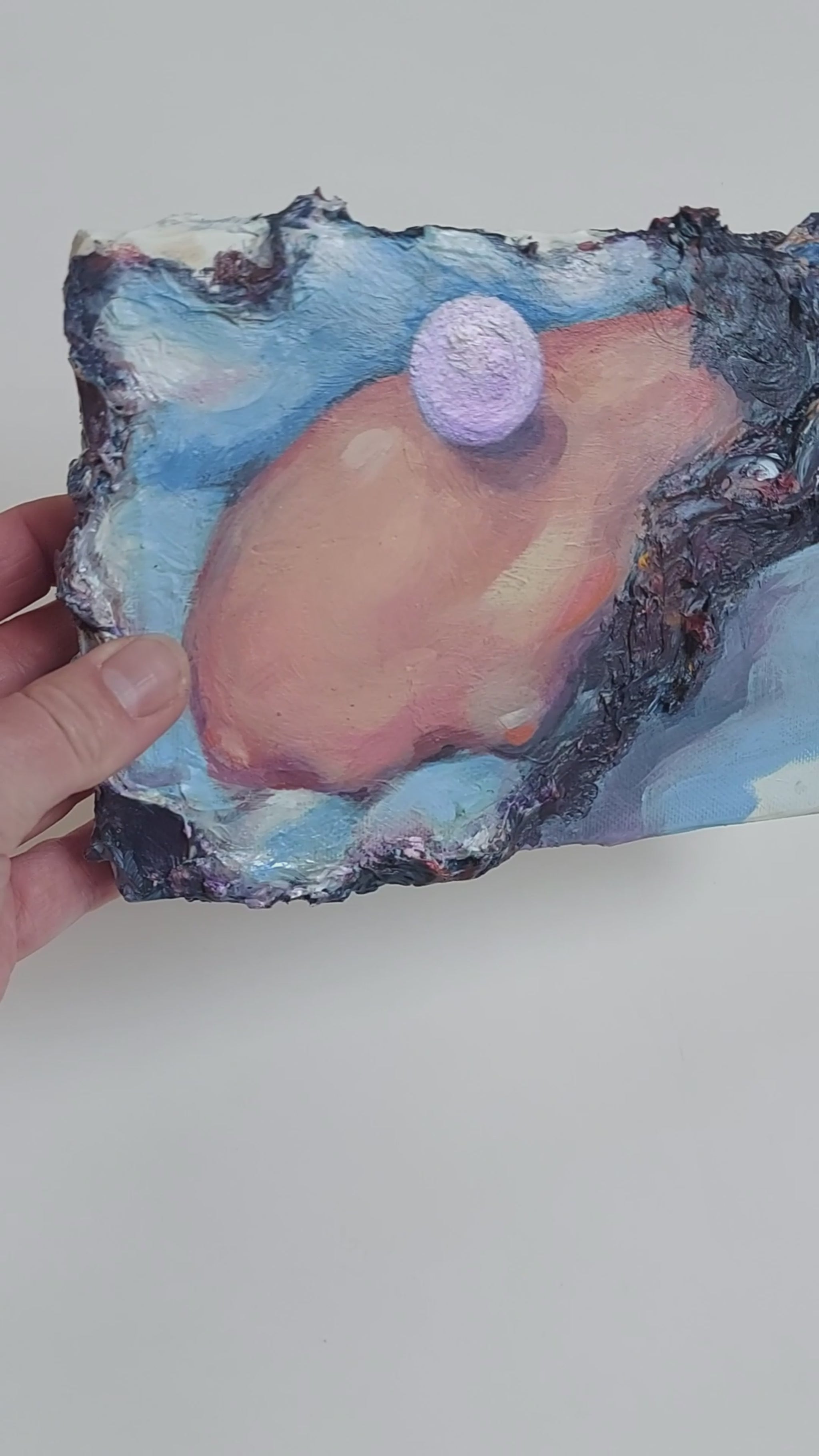 Handgeschilderd in acryl met medium, waarbij de impasto-techniek zorgt voor een speelse 3D textuur met een bijna keramiek-achtige uitstraling.