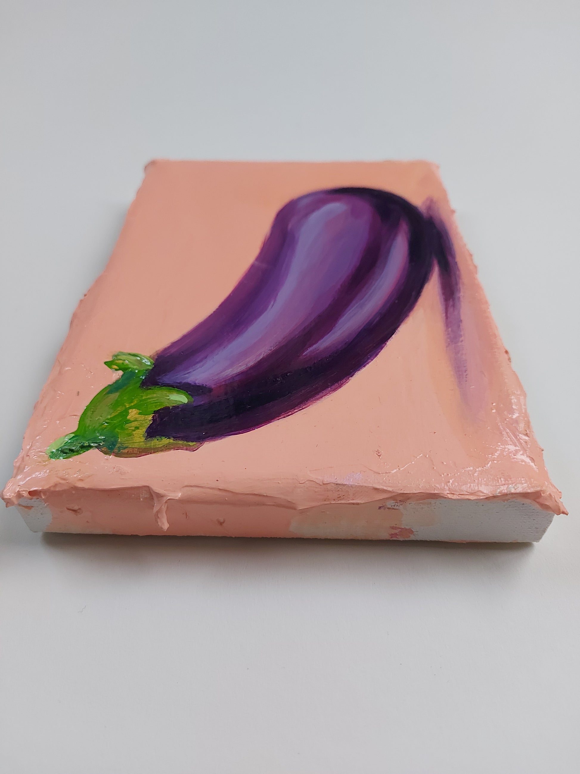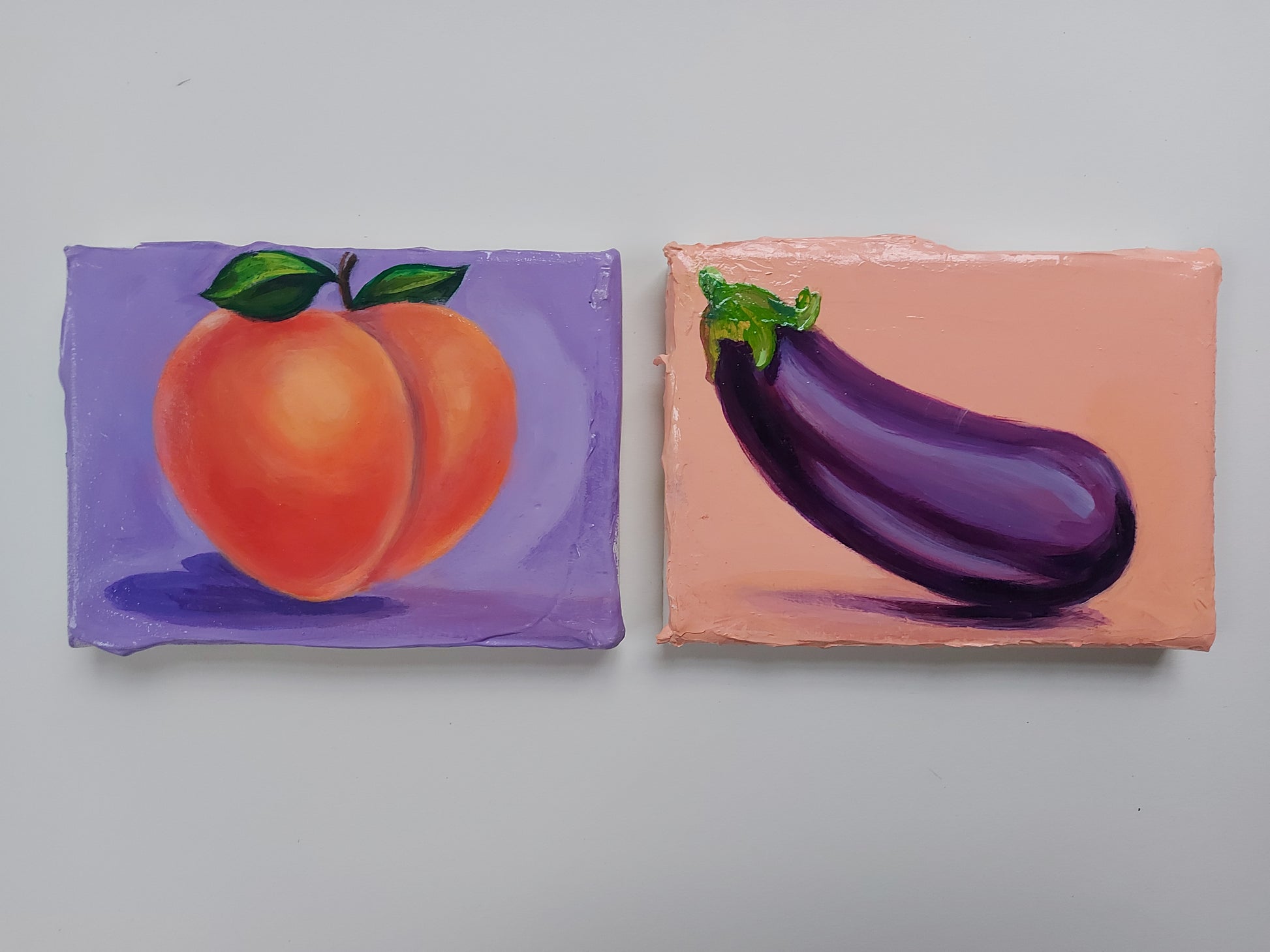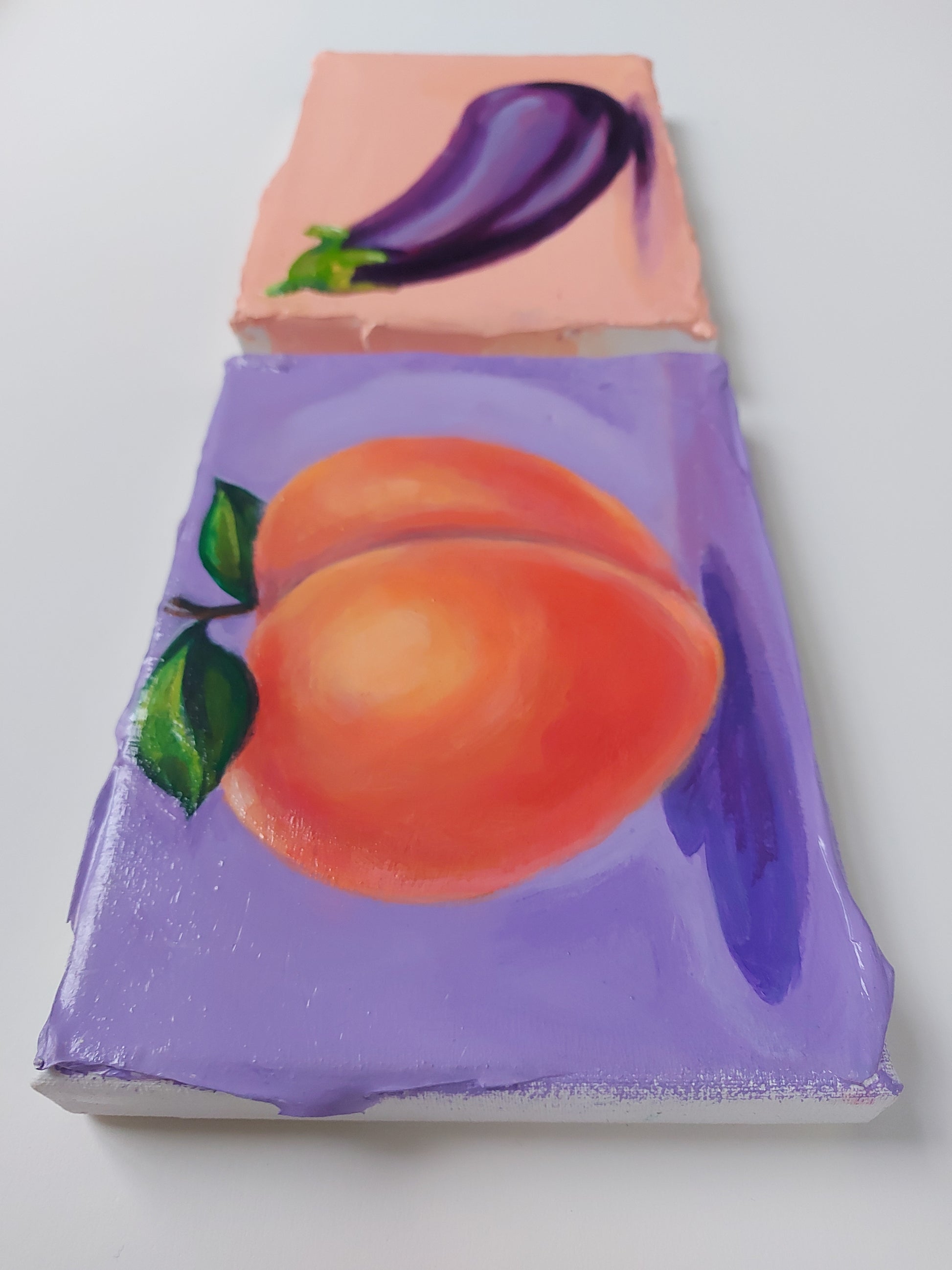 Sold * -A 'juicy couple'' from the fruit emoji series. The peach and eggplant can be purchased together. Paintings 13 x 18 cm / 5.1 x 7.1 inches, acrylic and medium on canvas. High gloss finish.