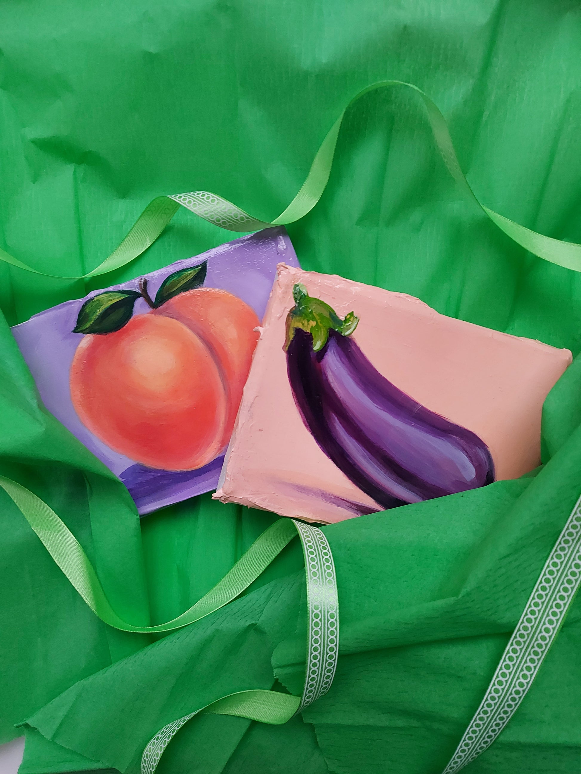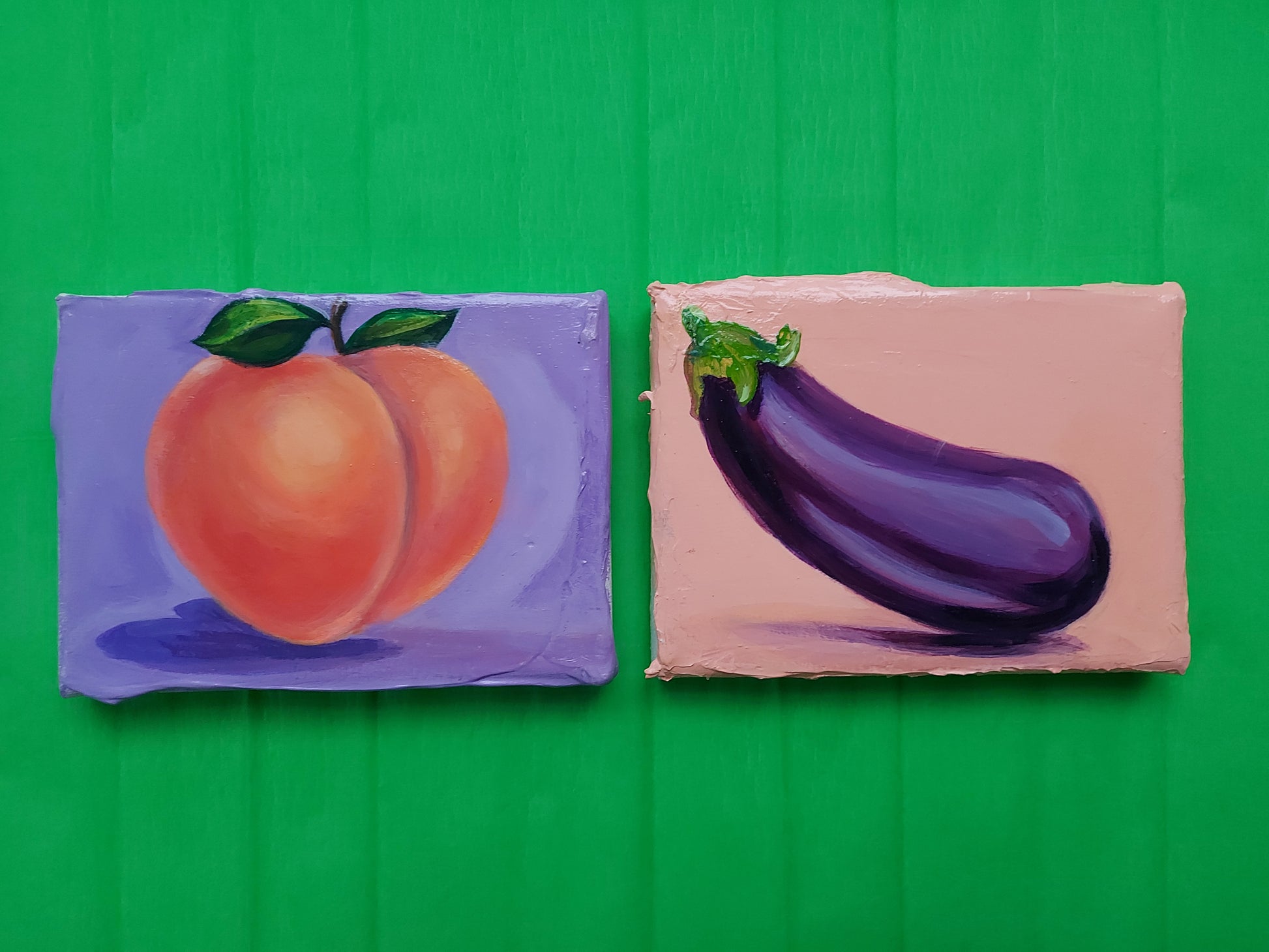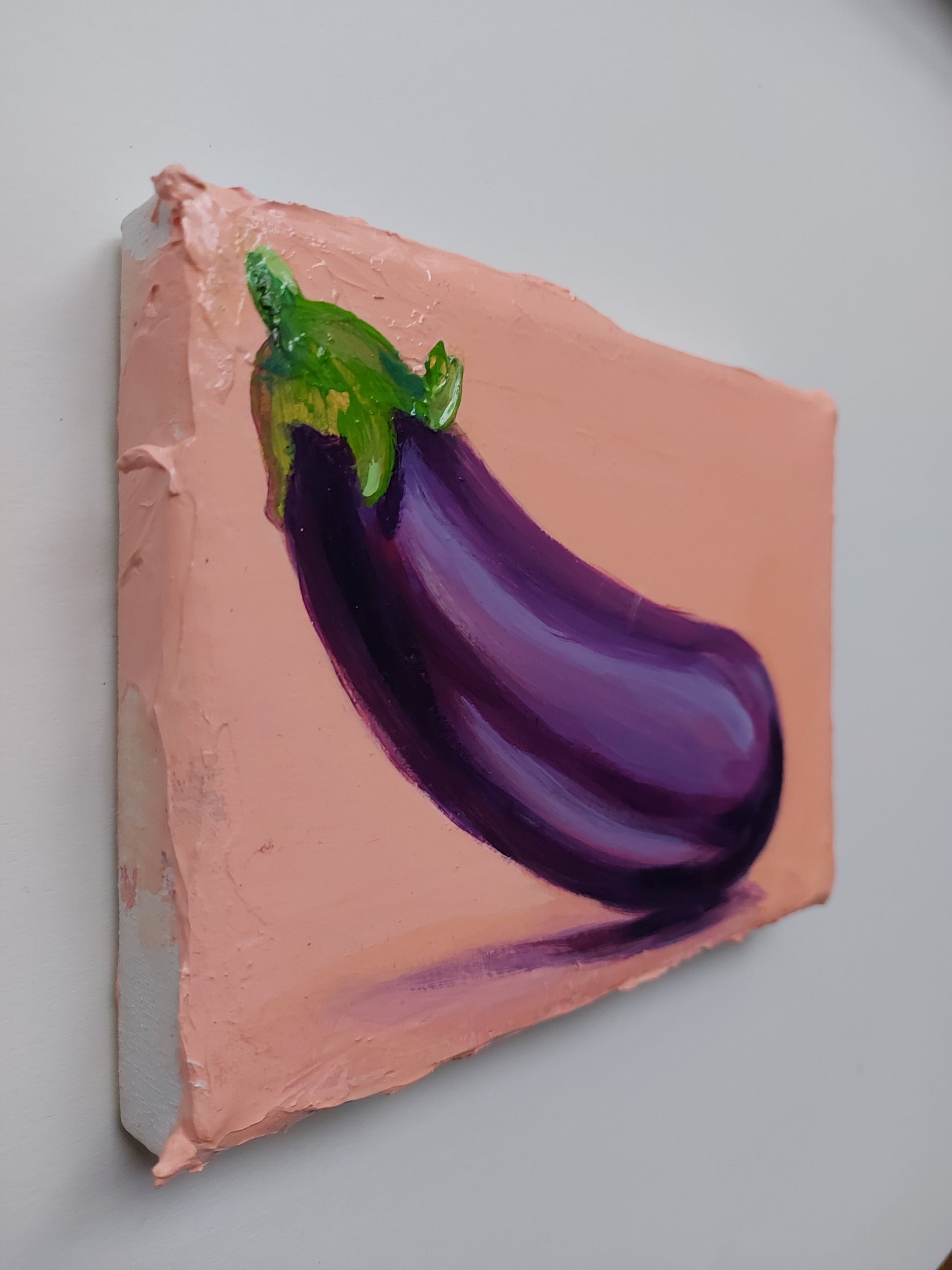 Sold * -A 'juicy couple'' from the fruit emoji series. The peach and eggplant can be purchased together. Paintings 13 x 18 cm / 5.1 x 7.1 inches, acrylic and medium on canvas. High gloss finish.